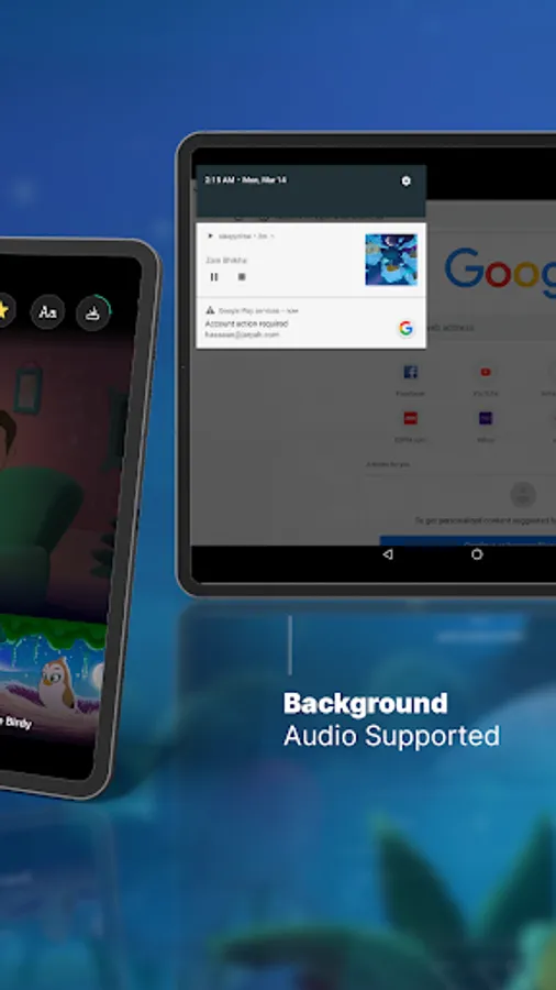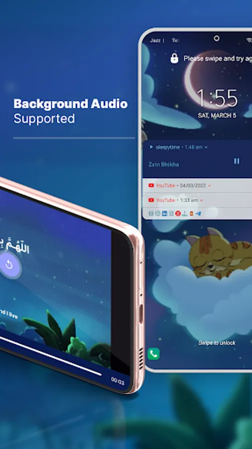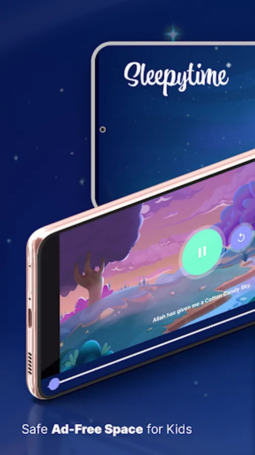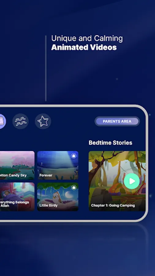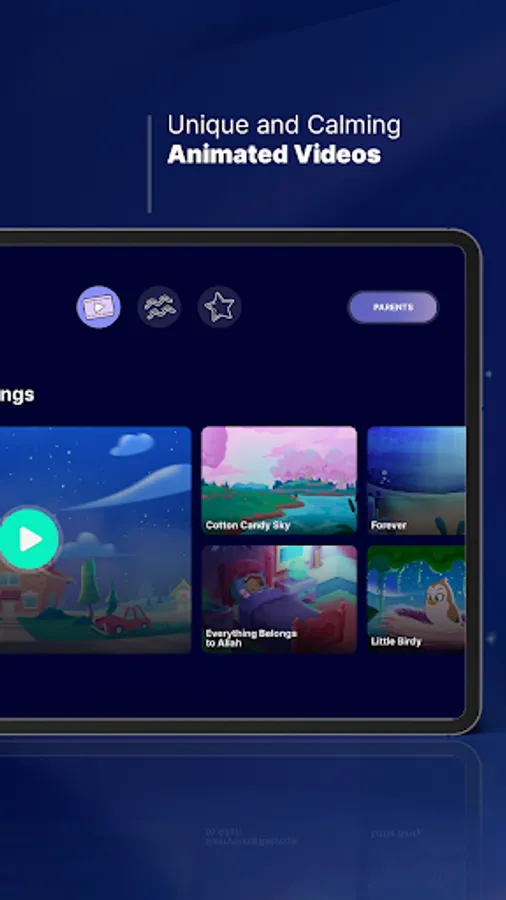Simply tap and play exclusively produced songs that are accompanied by sleep inducing, unique and calming animations. The relaxing sounds, warm environment, & soothing narrator’s voice create an enchanting experience that will help your child settle down and fall asleep in the remembrance of Allah.