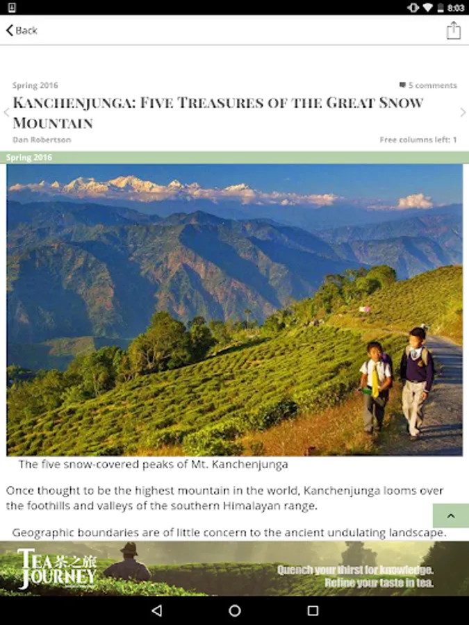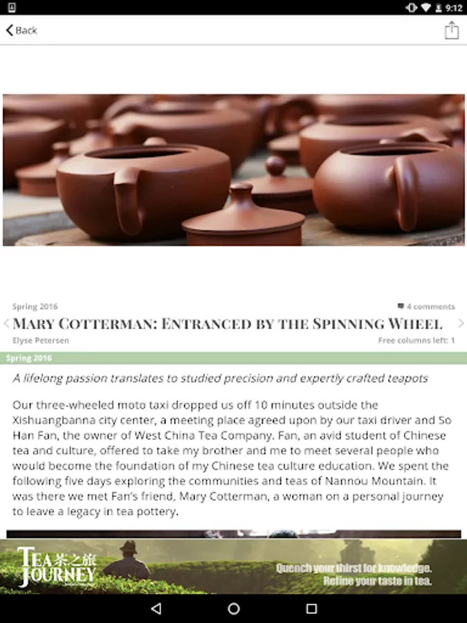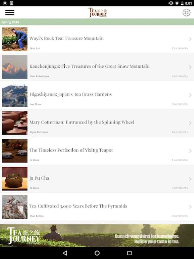 Tea Journey is formatted for print, but out of respect for the world’s forests it is distributed as a digital publication. The mobile magazine includes sections with tasting notes to develop your tea expertise, interviews with tea growers and tea masters, and profiles of artisans in teacraft and teaware. There are profiles of collectors, scientists, antiquities scholars and tea blenders. Targeting established tea lovers, thirsty for a deeper connection to culture and origin, each issue helps readers discover and refine their taste in tea – helping them select, correctly prepare, and serve the finest teas from around the world.