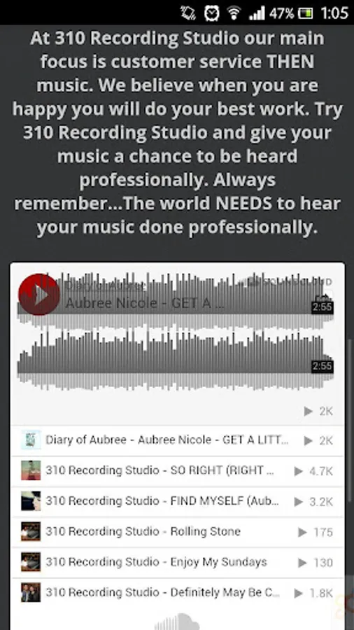 310 Recording Studio is an upscale, exclusive recording studio reserved for professionals. Whenever an artist tells us about visits to other studios they are usually traumatized and unfortunately, they have mostly themselves to blame for not properly researching. Listen to examples of the finished songs they've done and look for reviews. (Check out our reviews in the "reviews" tab)