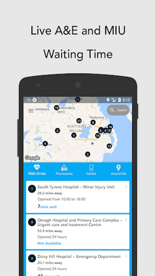 This app provides live waiting and travel times for A&E and MIU locations in Northern Ireland. It also provides information about the healthcare services available to you based on your location, helping you to choose the right service and spend less time waiting.