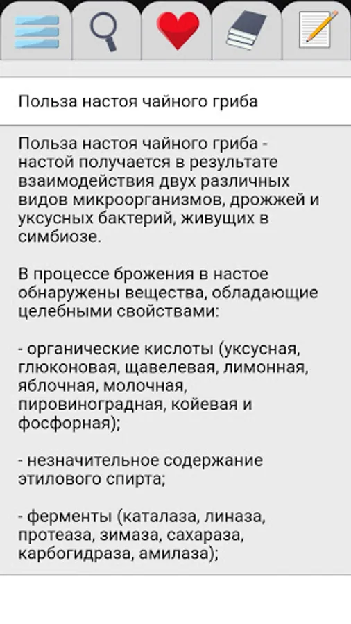 The infusion is obtained by the interaction of two different types of microorganisms, yeast and acetic bacteria, living in symbiosis. In the process of fermentation in the infusion, substances with healing properties were found: