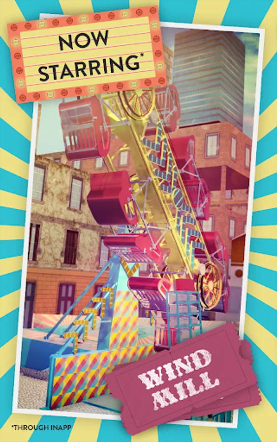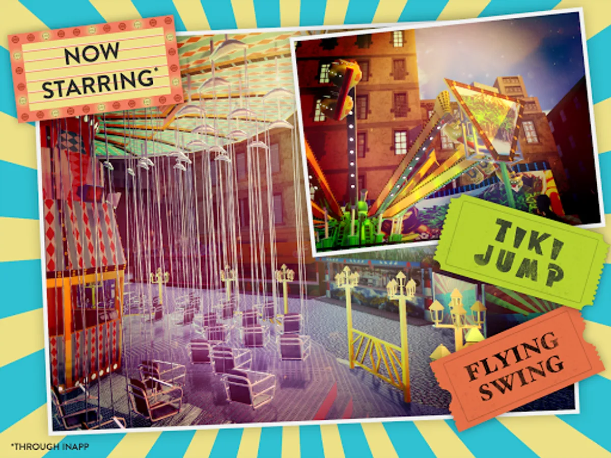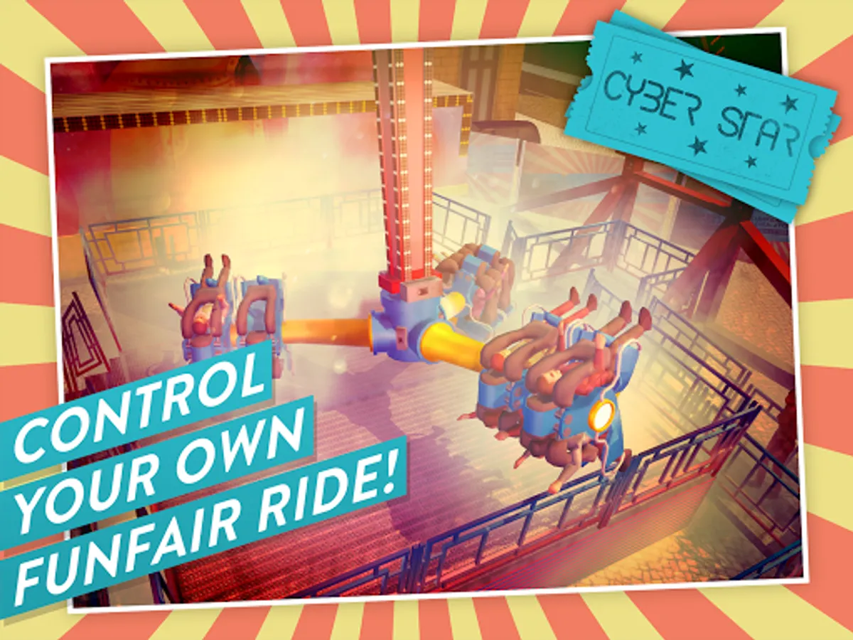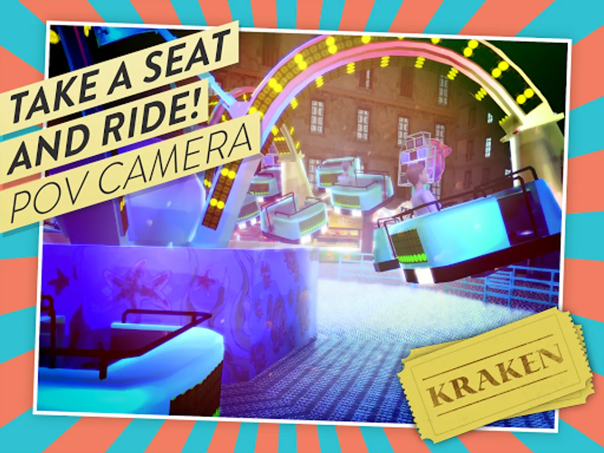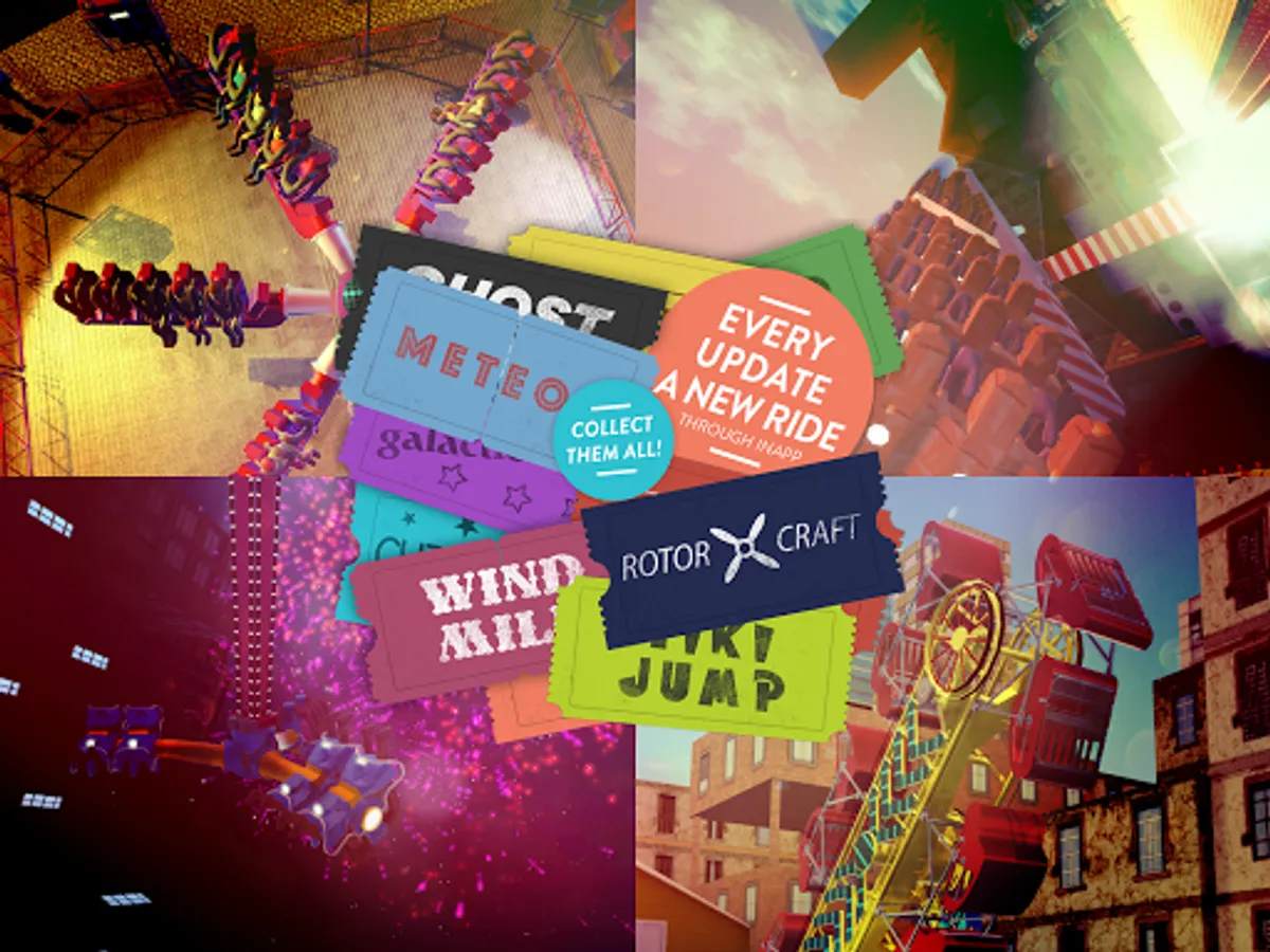 The app includes two unique rides ("Kraken" and "Cyber Star"). Further rides available: "Gold Mine", "Galactic Race", "Vodoo Swing", "Flying Zeppelin", "Ghost Spin", "Windmill", "Rotorcraft" and "Tiki Jump". In addition, we provide new rides in every update (by InApp).