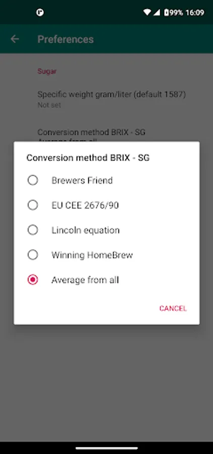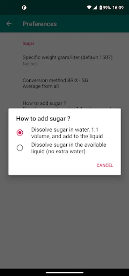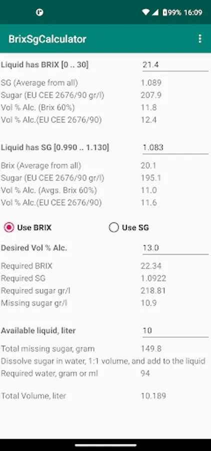 I needed a simple and ad-free app to do those kinds of calculations. In addition calculate the amount of sugar required for brewing wine with a certain Vol % of alcohol. Also important: remember all input values so that I do not need to re-enter them with each app start.