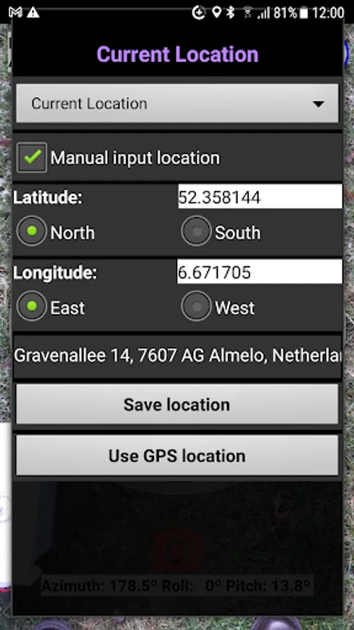 The app needs to know the location which is found via GPS or entered via manual input (typed in) ad numbers in degrees or as an address.