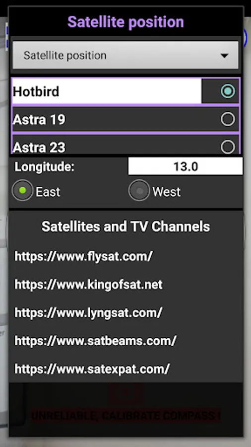 This app does not come with a satellite list. Instead it remembers up to 25 satellites. Just enter a name and the longitude of the satellite, example: "Hot Bird 13E" is at longitude 13.0 degrees East.