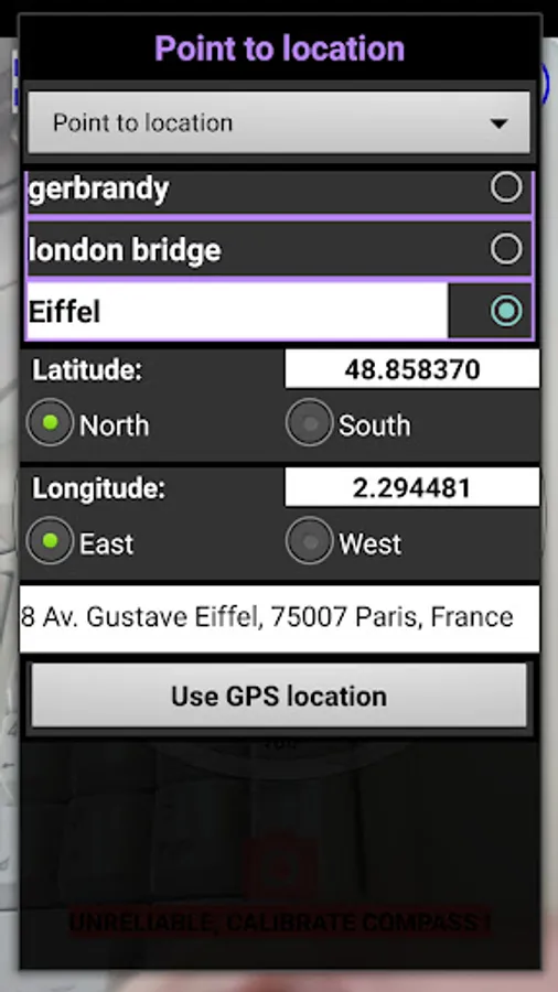 The compass can point to a location. Examples: An address, a parking place or a radio station. Enter an address and the compass will point you in the direction. Or save the current GPS location as point, go for a walk and find your way back with the help of the saved location. Up to 25 locations are remembered.