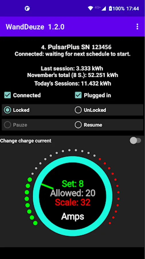 The labels "Connected", ""Locked, "Unlocked", "Pauze", "Resume" and "Change charge current" can have one of the next colors: