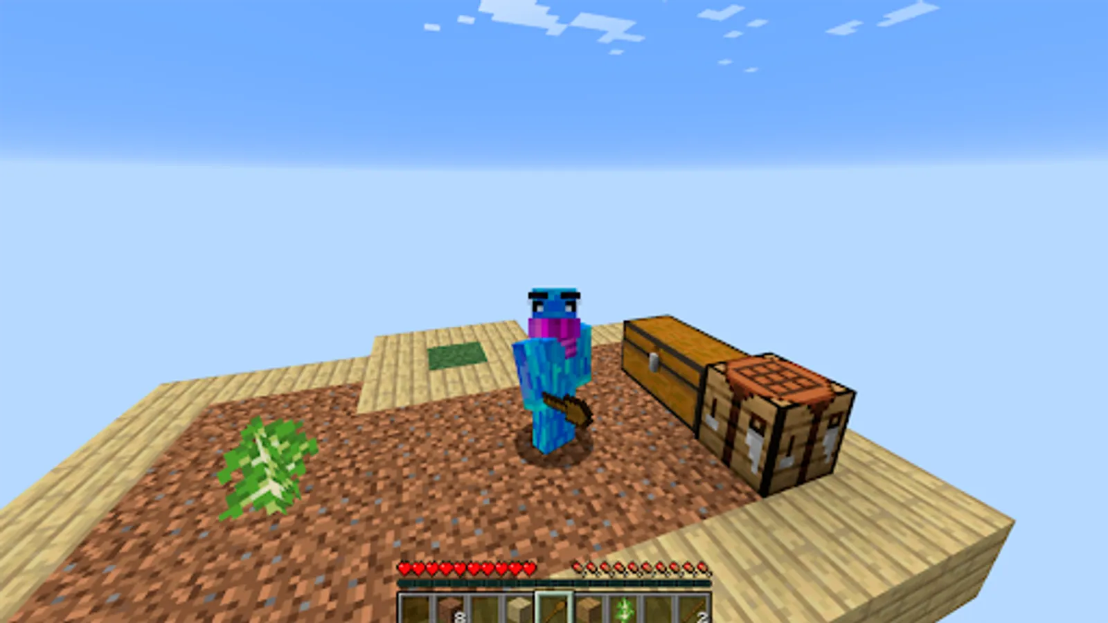 In the Skyblock survival map you find yourself on a small flying island. Next to you is a tree and a chest, where you'll find just a few of the most basic things you need to survive on skyblock.