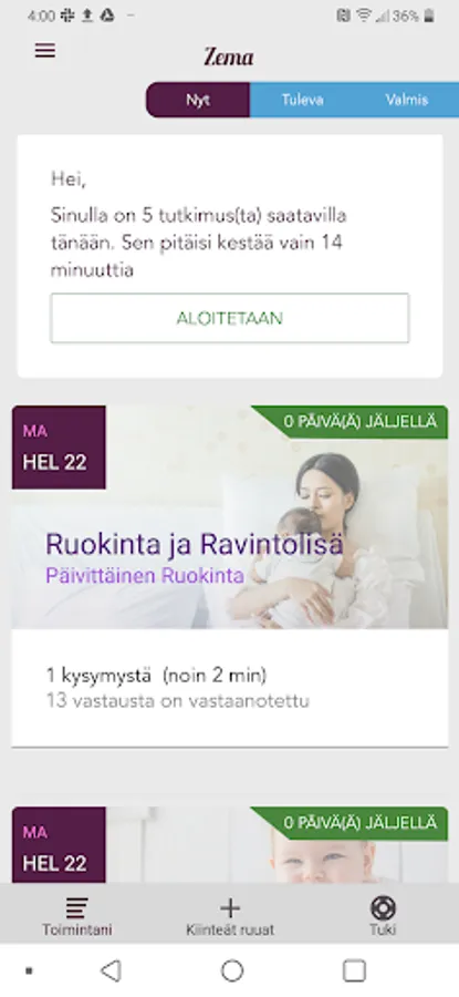 App to help parents provide information on feeding and care habits during early motherhood. Parents may share how and what they feed their child via surveys.