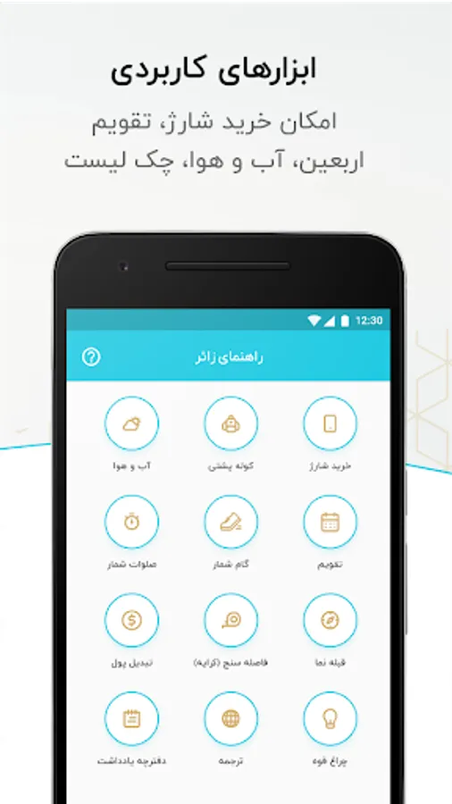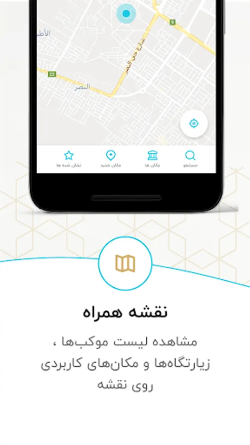 - Visibility of locations within walking distance of Arbaeen on the map such as: carpets, hotels, inns, mosques, shrines, health centers, pharmacies, schools, parking, restaurants, pilgrimage centers, shops, travel agencies and currency exchange offices.