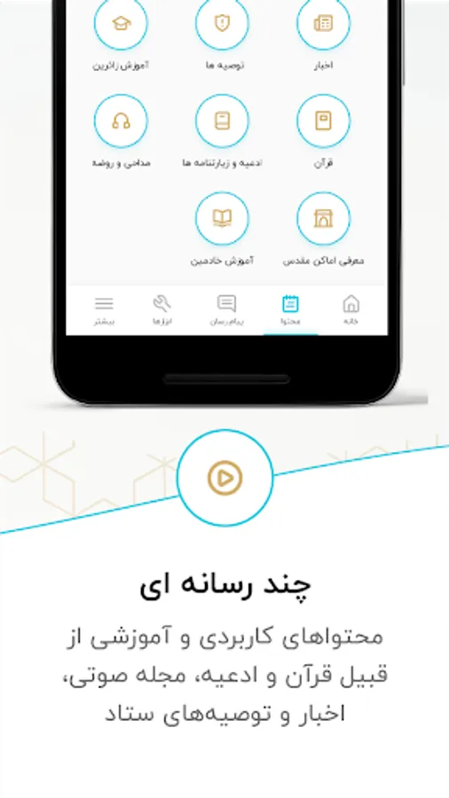 - Multimedia content including news, important announcements, recommendations, practical training for pilgrims, along with travel commands, introduction of sacred places, full text of the Qur'an, allegations and pilgrimages, as well as audio magazine including prayers, lectures and recitations