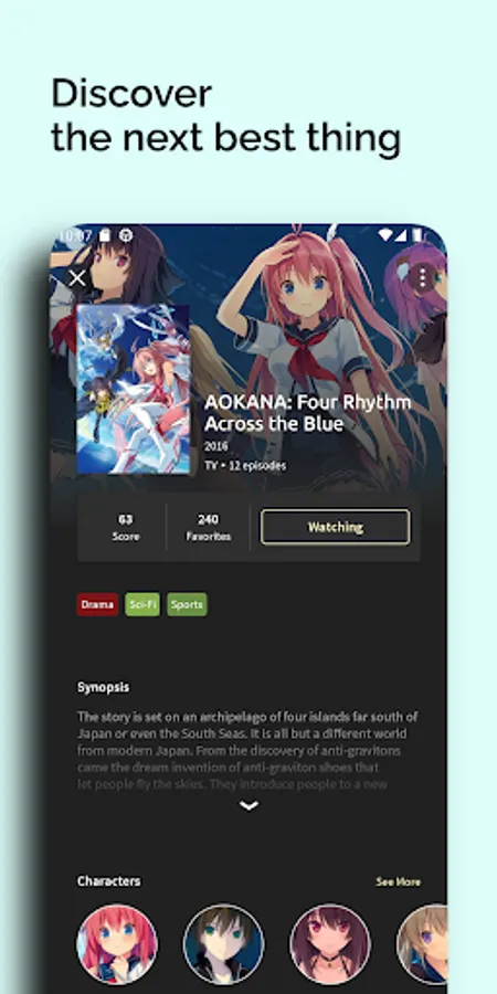 - View detailed info of anime, manga, characters, staffs, and studios.