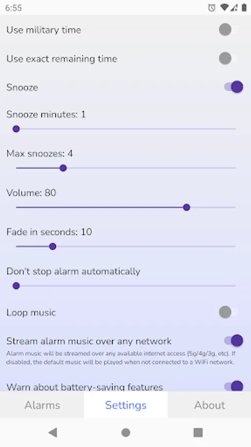 -Snooze mode, with configurable minutes and maximum snooze count.