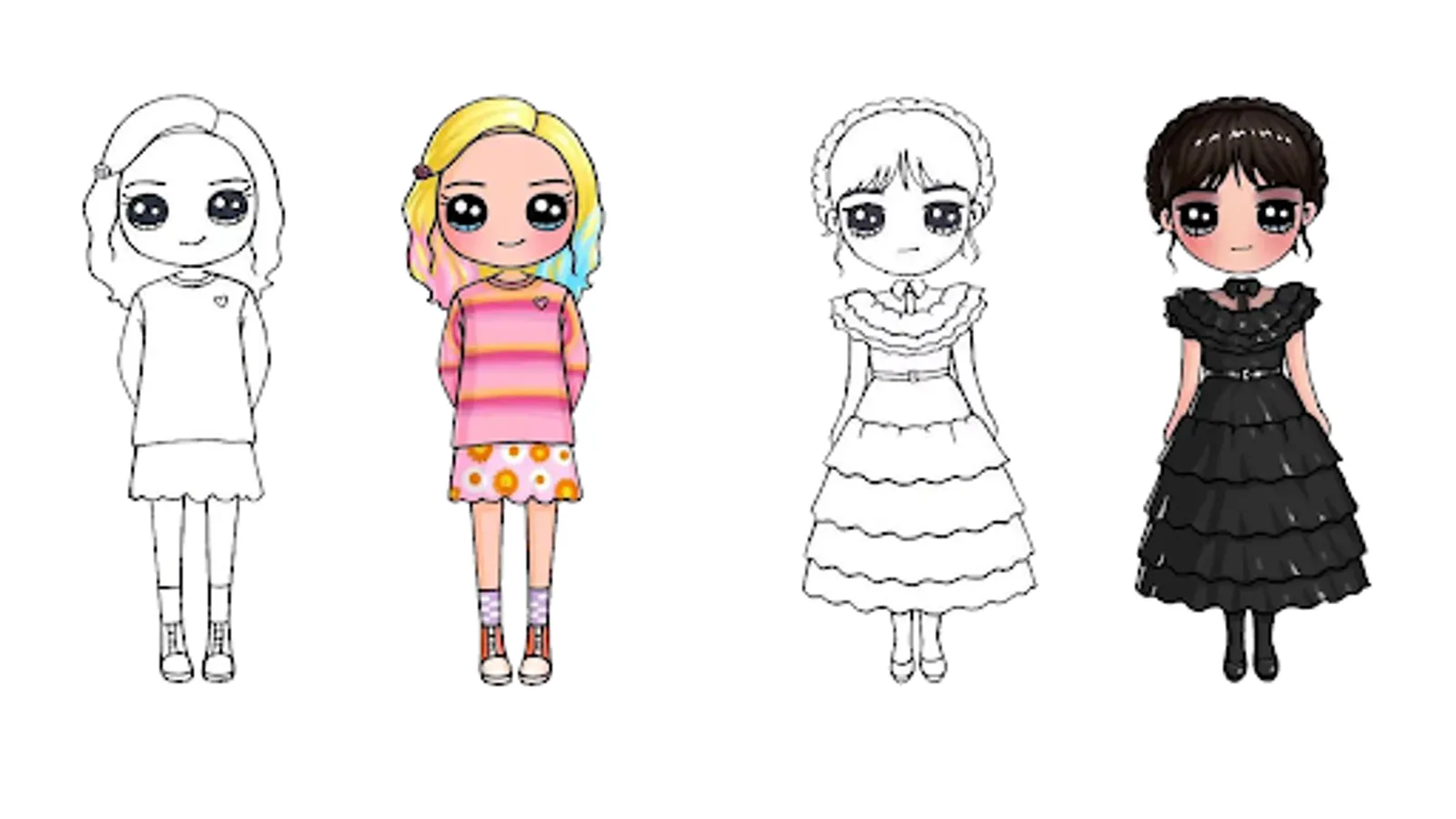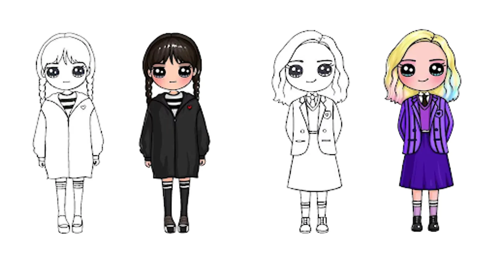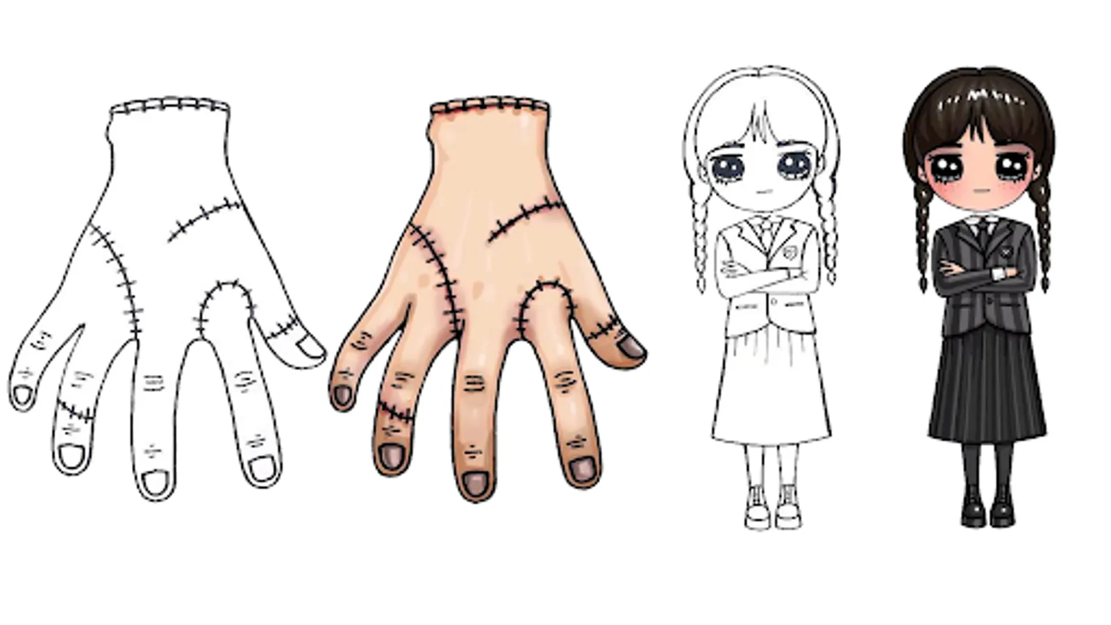 The “How to draw Wednesday Addams characters step by step” app teaches you how to draw Wednesday Thing characters on a piece of paper easily through step by step guide and detailed tutorial.