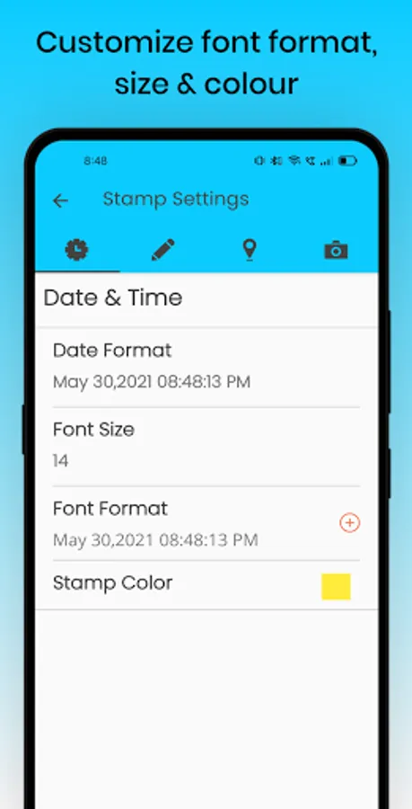 Settings here you can done by your preferences, you can change font, time-stamp position, photo name, change it easily.