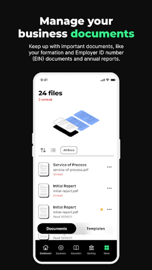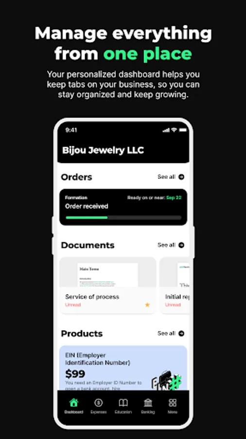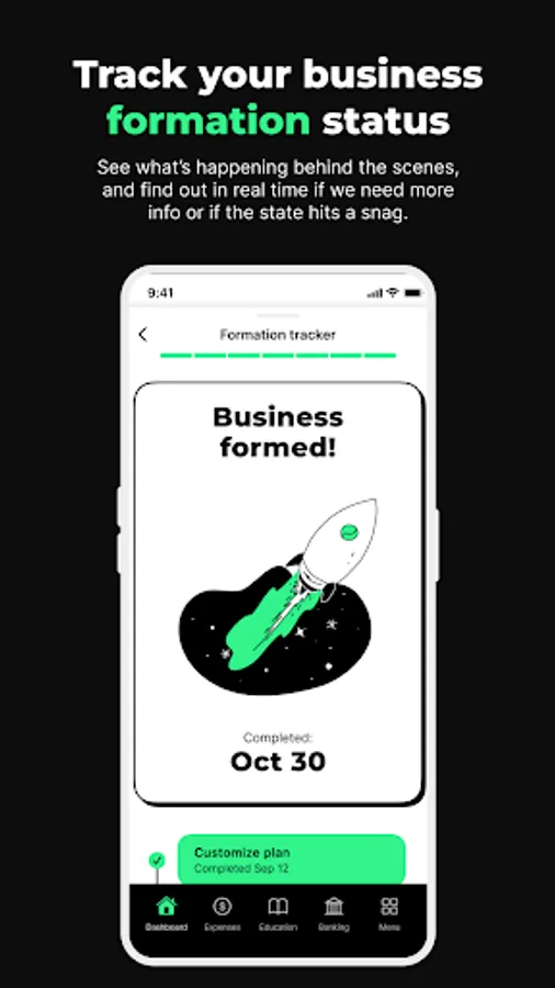 Run your business like a boss, all from one app. Track your formation status, tag business expenses, access documents for compliance, chat with us for support, and more.