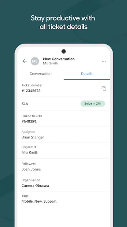 Add the right people to the conversation with @mentions, create new tickets and update assignees and CCs, plus add followers, tags, and any other field while on the move.