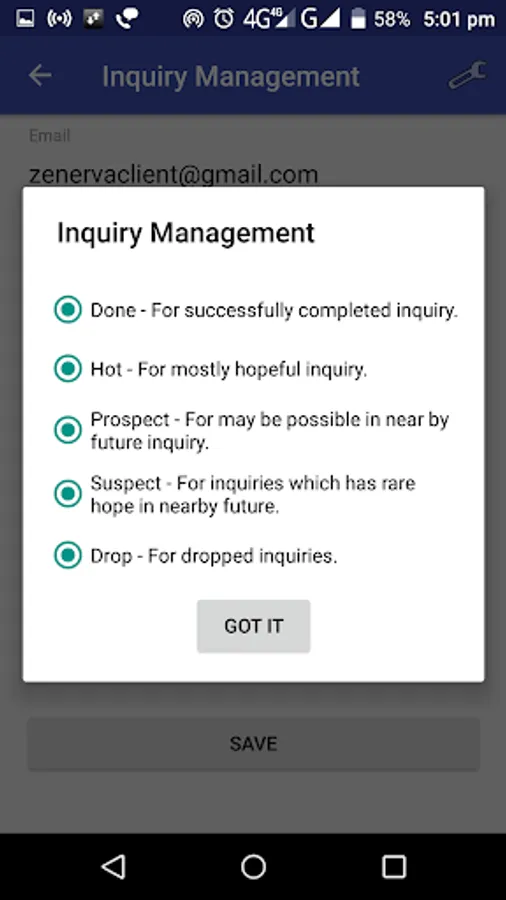 * Inquiry Management app reminds you to call scheduled appointments. Hence, will never disgrace yourself again in front of business partners, clients.