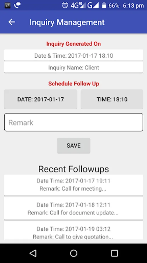 * Inquiry Management helps you never forget calls, follow-ups anytime or call too late, it reminds your calls in your busy schedule.