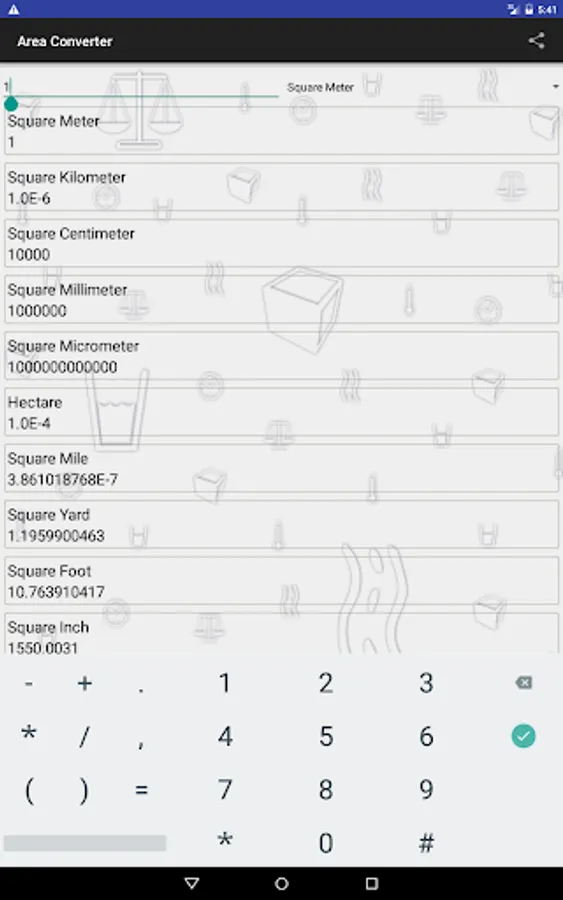 • Area (square kilo meter, square mile, hectare, acre, etc)