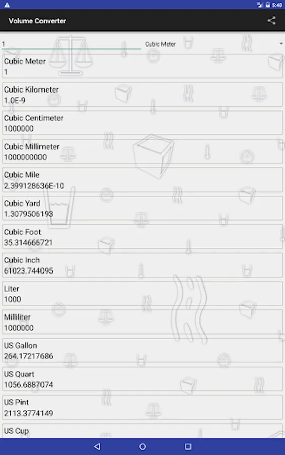 • Volume (Cubic meter, Cubic Kilometer, Cubic Centimeter, etc)