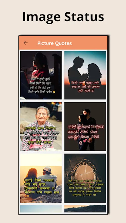 The Best collection of Nepali status, sad status, breakup status, heart touching status, Shayari status. There are 8+ Nepali status categories that help you can use while chatting or to impress anyone. We will update the app regularly with new features for our users.