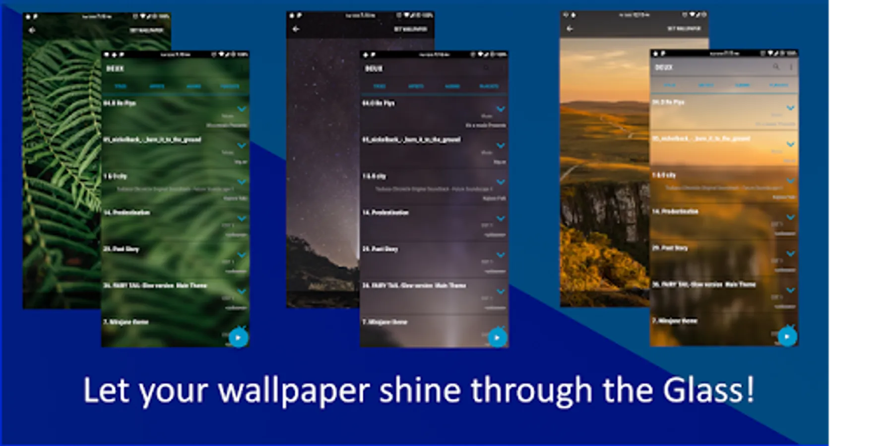 6 different themes for differing tastes. Featuring both colorful and muted gradients. Or you can use glass theme and see Dual Music Player beautifully blur over your wallpaper like glass. (Does not work with live wallpapers).