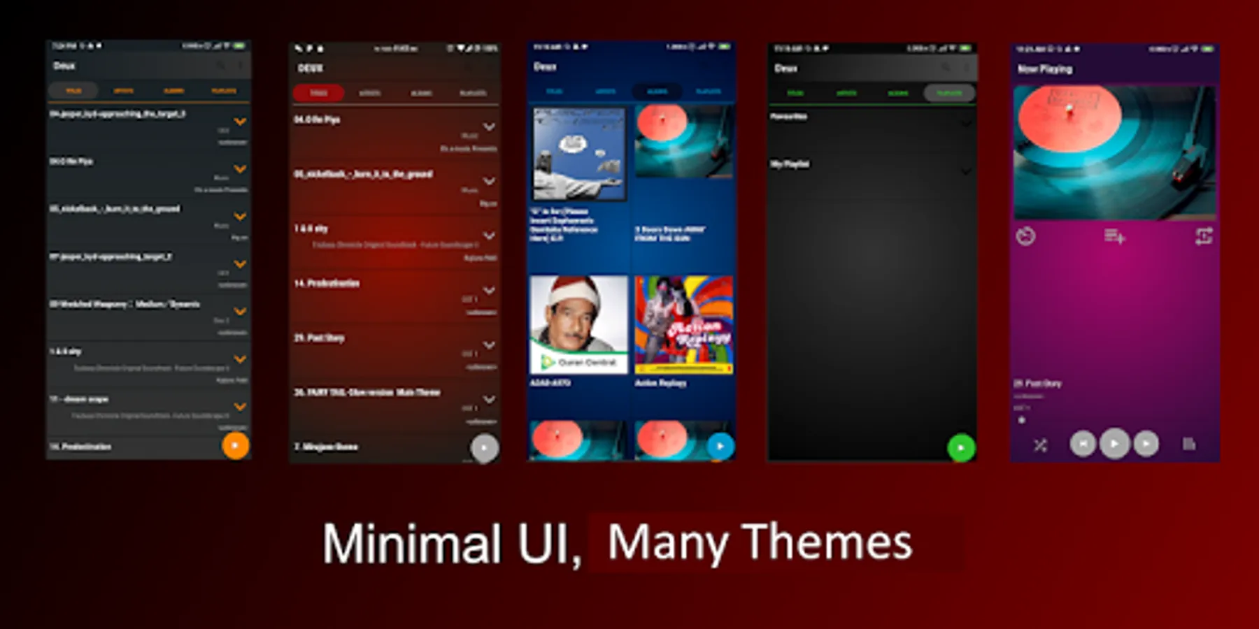 Minimalist UI. Elegant use of screen space allows you to browse music at a glance with Dual Music Player. Music titles will always occupy space to the left while Music artist and album are stepped off to the right.