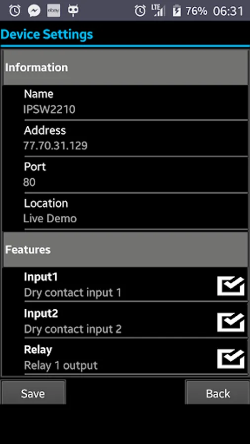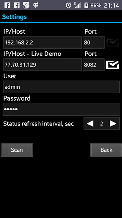 The Application allows to enter IP address, port and authentication of your installed device.