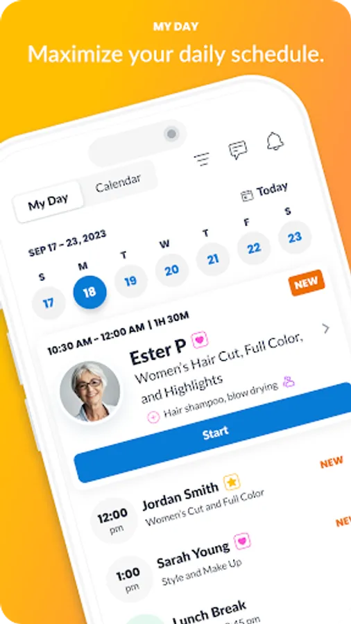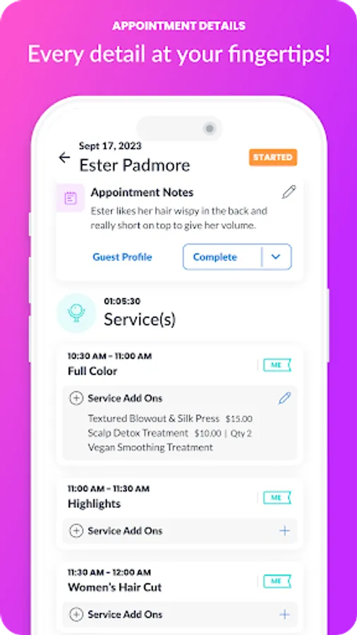 Our app simplifies your scheduling process. View your appointments effortlessly in a sleek calendar or list format. Instantly access details about your guests, their chosen services, and even discover which other providers they will encounter throughout the day.
