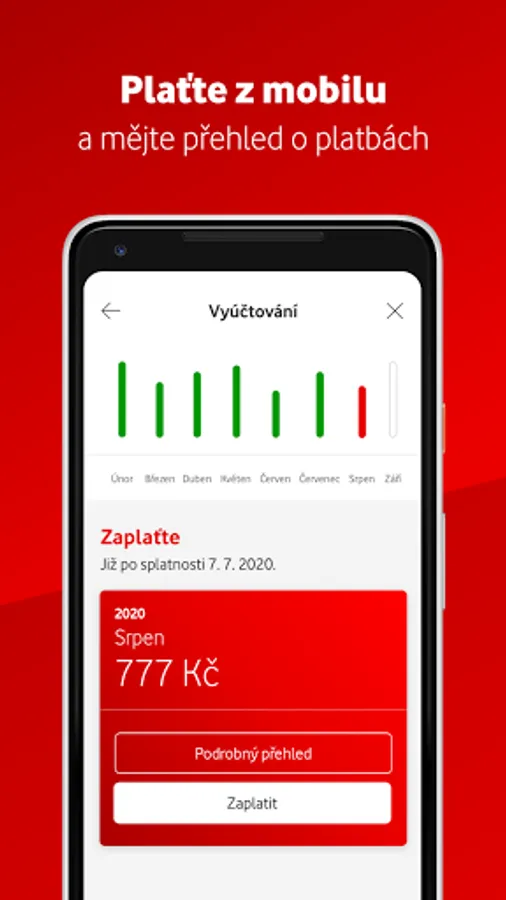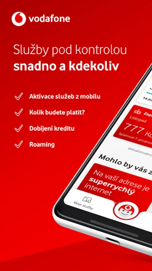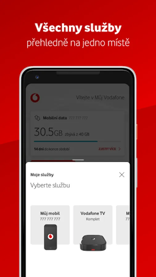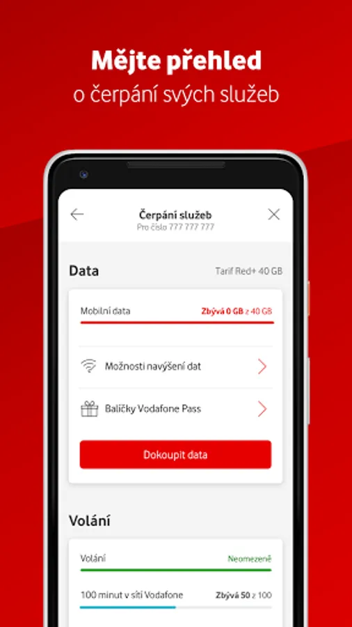 Thanks to My Vodafone application you can control your account anytime from anywhere. You can log in easily with your phone number, or e-mail and password, and right away you will receive actual overview about your units usage (data, free minutes and SMS) or for example about your billing status.