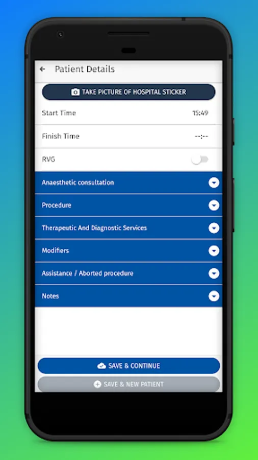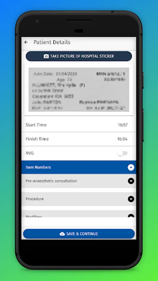 This app is currently designed for our anaesthetists. It enables you to take a photo of a sticker, record anaesthetic item numbers according to the specialty of the surgeon and automatically suggests the start time and finish time of the case.