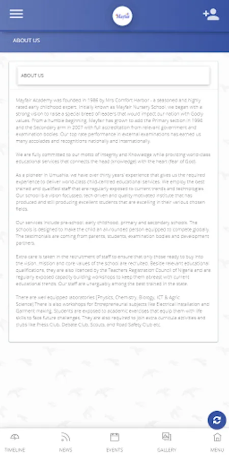 Mayfair Academy Mobile APP is a remarkable mobile application. With the aim of bridging the educational gap between parents, teachers and the school to effectively raise first class students.