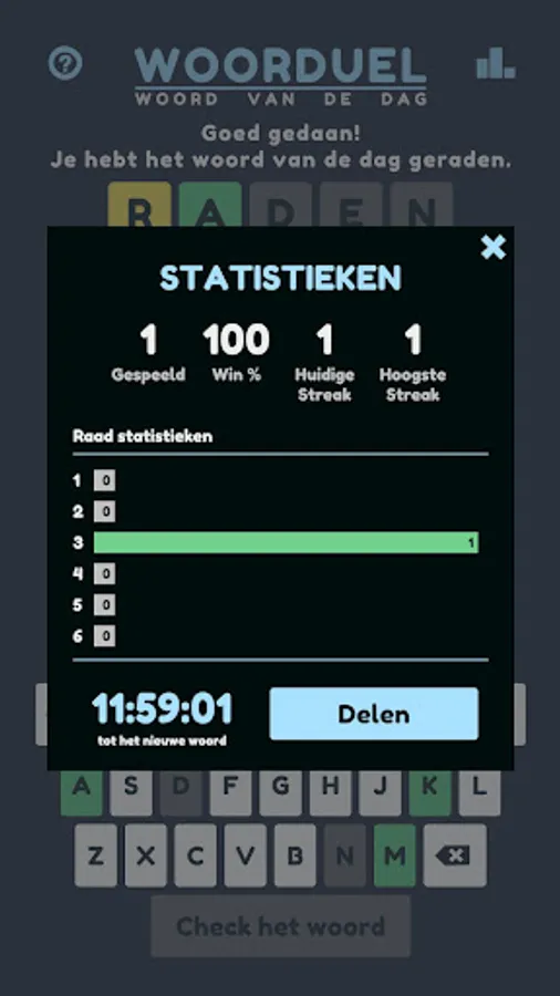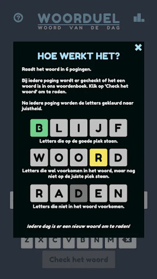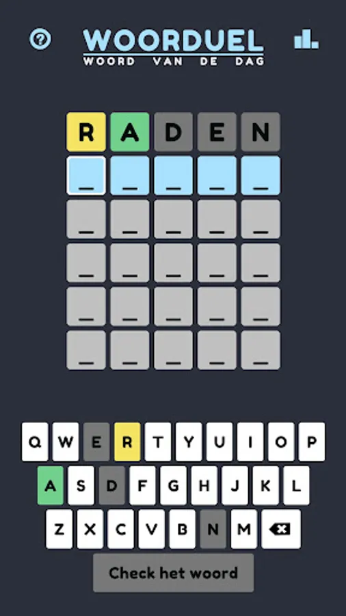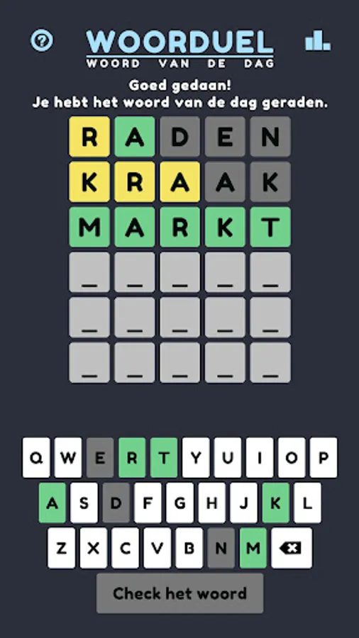 Woorduel is a game with which you can guess a new Dutch word every day. It is reminiscent of Lingo and Mastermind; You have 6 turns to guess the 5-letter word of the day and receive hints about the correct and incorrect letters in the word after each attempt.