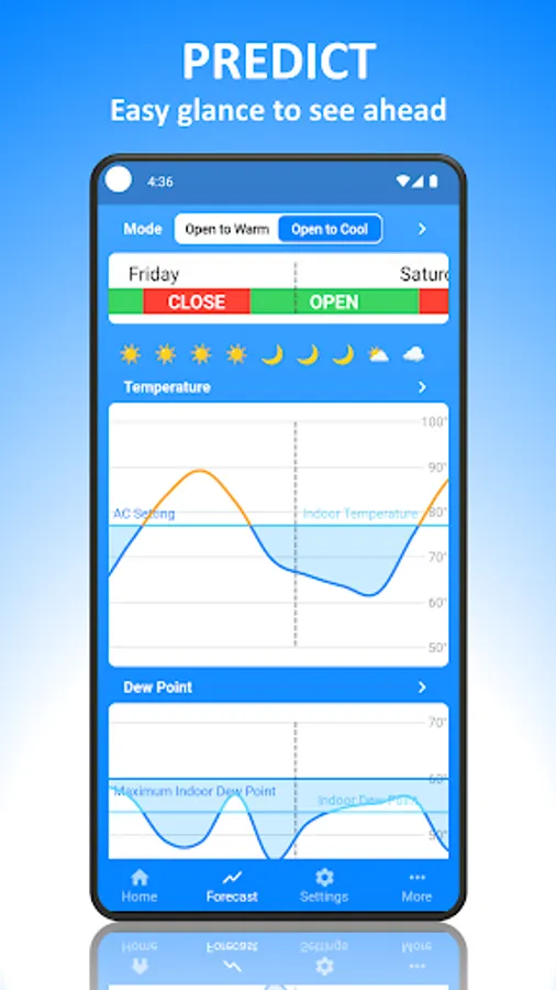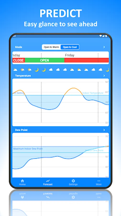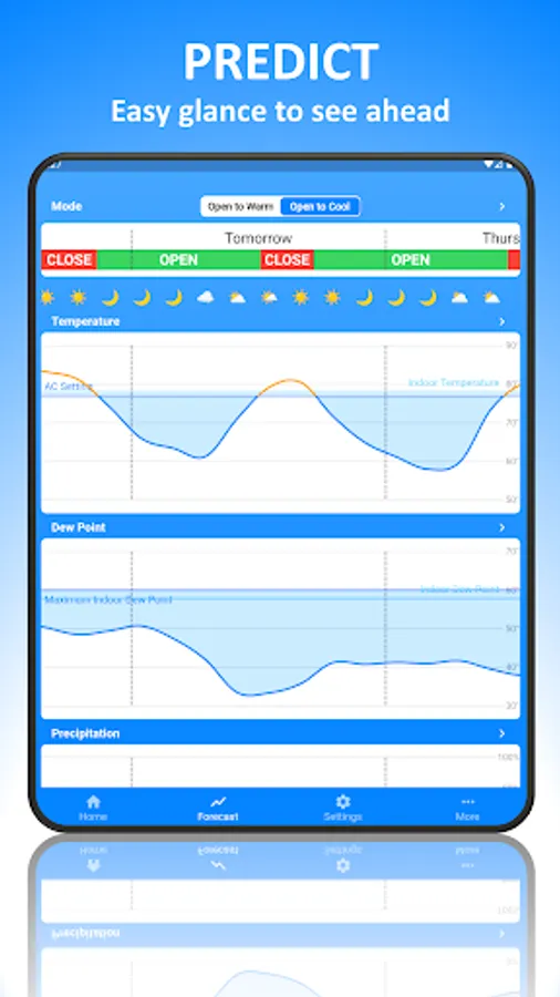 This app looks at current and forecast weather conditions and compares them to your home’s current conditions. It analyzes temperature, dew point, and the possibility of rain over time. You choose how aggressive your window opening strategy is, and it does the math for you to tell you the best times to open and close your windows and why.