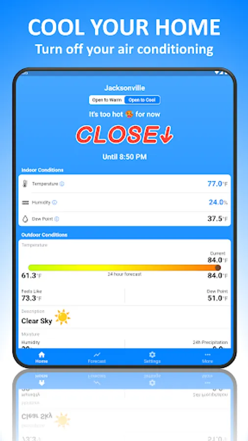 The app is free to use and can help you to minimize your air conditioning usage to save on your utility bills. Studies have estimated that a good window opening strategy can reduce air conditioning energy consumption by as much as 30%. It's a great way to bring fresh air into your home, cool it down quickly when conditions are favorable, and help you to sleep better. It can even tell you when to open your windows on an unseasonably warm day.