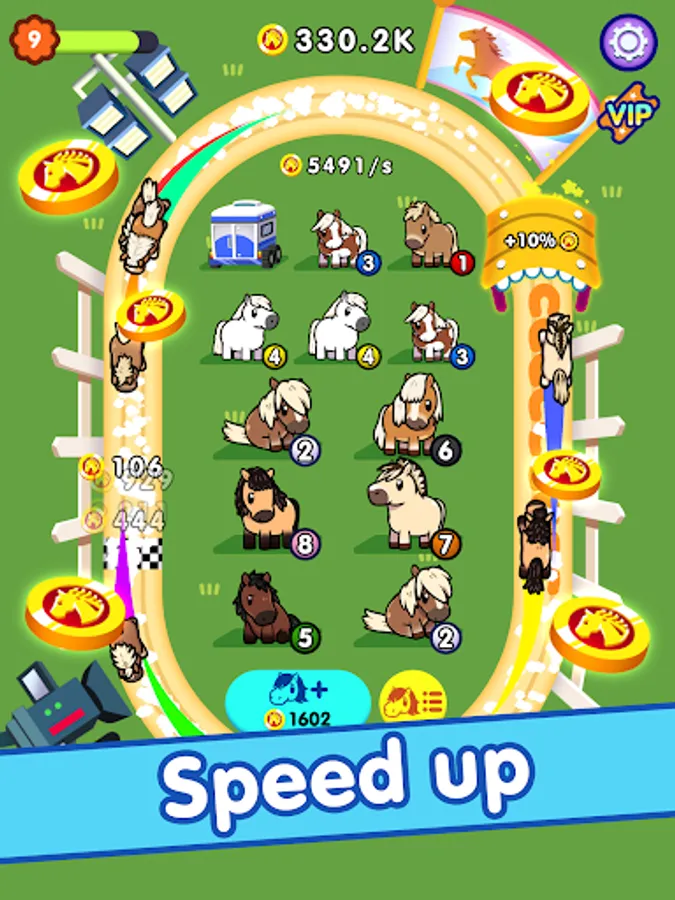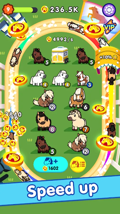 Start with a pony and upgrade them by combining them into faster horses.