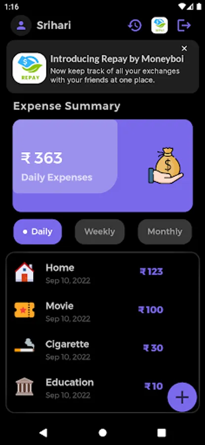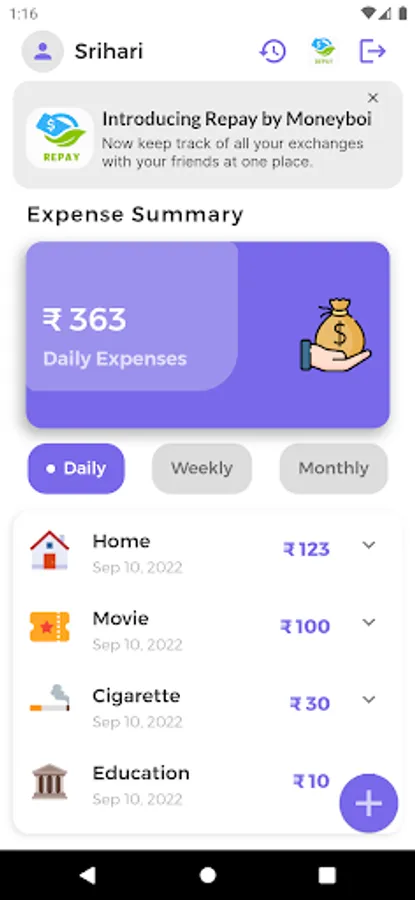 Using Repay by moneyboi, now track your transactions with your friends and never miss a rupee again. Send friend requests to your friends using their registered email id, create a repay account and start tracking your incoming and outgoing transactions together.
