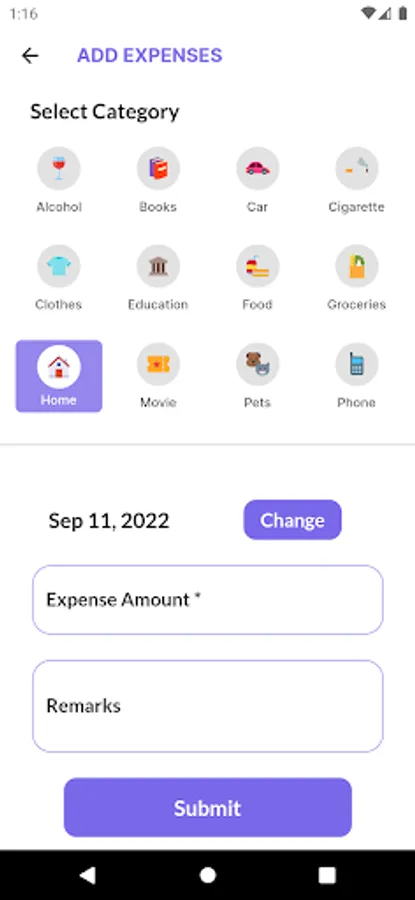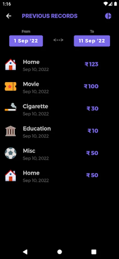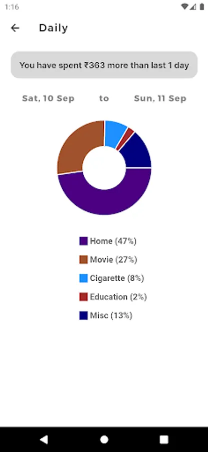 View date wise records of your expenses as a list or a pie-chart and get short comparison texts about your previous expense records.