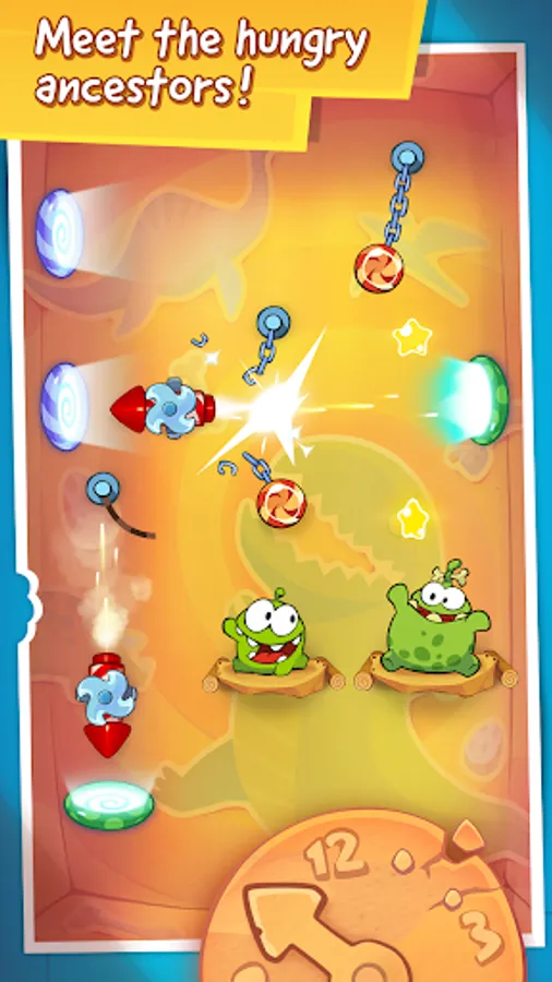 There’s no time to waste! Visit exciting locations including the Middle Ages, the Renaissance, a Pirate Ship, Ancient Egypt, Ancient Greece, the Stone Age, Disco Era, Wild West, Asian Dynasty, Industrial Revolution and the Future. Om Nom’s ancestors are waiting – and they’re getting really hungry for candy!