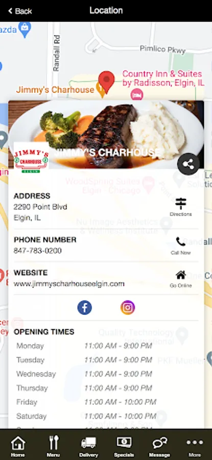 Whether you desire tasty appetizers, a crisp chef's salad, scrumptious shrimp alfredo, a savory boneless chicken breast sandwich, or a hearty charbroiled steak dinner, Jimmy's Charhouse of Elgin is here to satisfy your cravings. Our Mobile app is designed to enhance our customers experience by keeping them up to date on our menu, specials and events. Our app provides easy food ordering and a loyalty program!