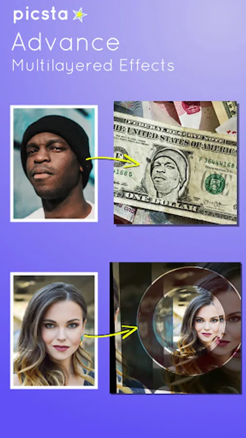 Picsta offers a huge collection of trending, funny, creative photo effects. You will find hundreds of effects and templates including creative frames, overlay photo effects and filters which you can use on your photos.