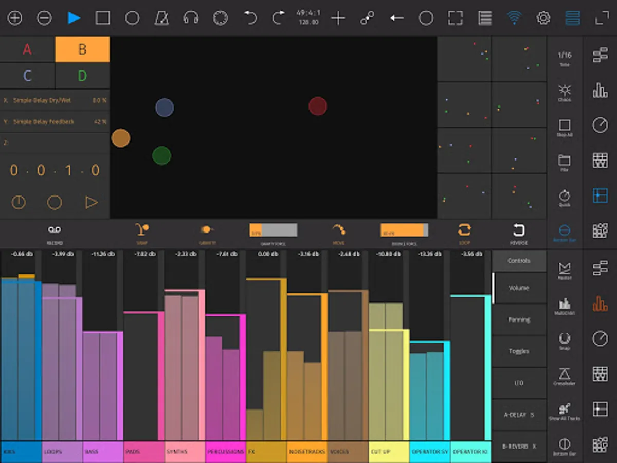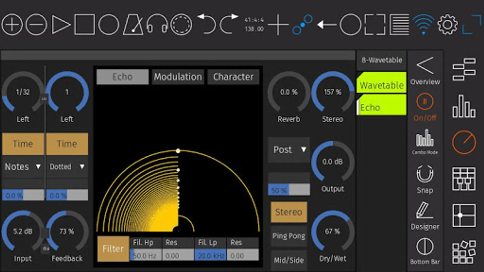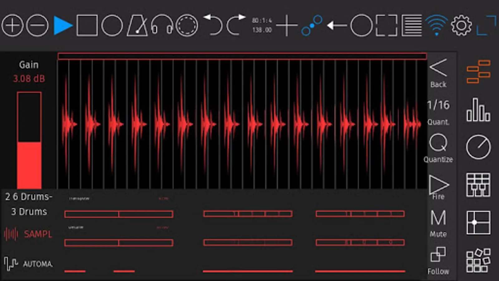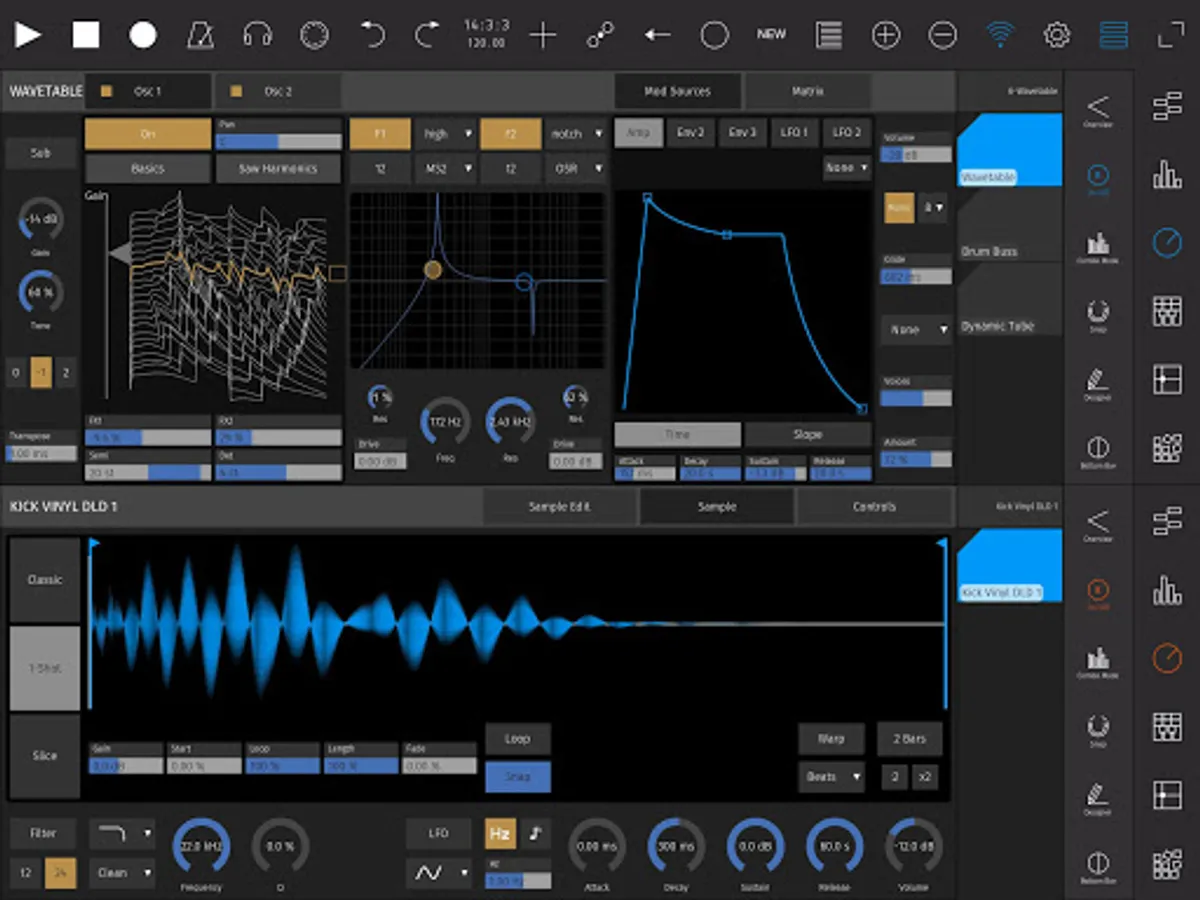 - Play instruments with grid or piano-style layouts, with scales, note repeat, aftertouch, and velocity (based on finger position)