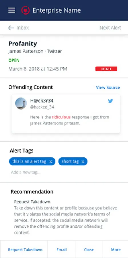 Protect your brand and business from social and digital risk wherever you are. ZeroFOX notifies you to threats facing your organization on social media, mobile, surface, deep and dark web and more. Whether you’re in the office, in a meeting, offsite or at an event, ZeroFOX keeps you informed and protected with actionable alerts. From within the app, access alerts and take action to remediate potential threats. With ZeroFOX, you’ll never miss a critical alert.