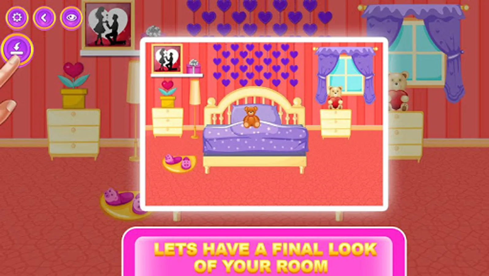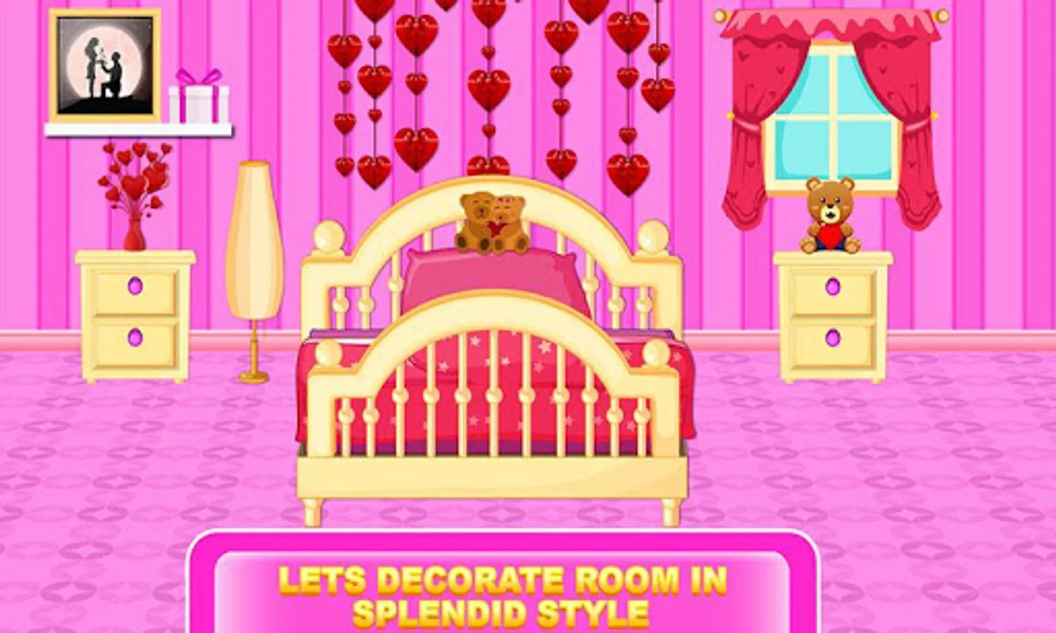 Valentine day is very special for a princess and she wants to celebrate that day with someone. Princess, This is your first Valentine day date! Your bedroom is tidy I know you want your bedroom to be pretty and give the best impression.No worries! We will help you to be perfect! Choose from tons of fashionable wall color, beds, photo frame, teddy bear, floor, wall frames, gifts, lights, flower pots, tables and much more. Impress your loved one by showing your decorating skill. If so, play this "Valentine Game" and find your partner for this valentine.