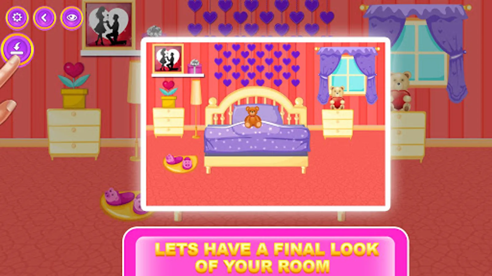 Valentine's Day is a happy and love day!! The date is about to begin but she is not ready now she wants your help on valentines Date for decorating the room with beautiful design option so the room looks beautiful on this Valentineβs Day.