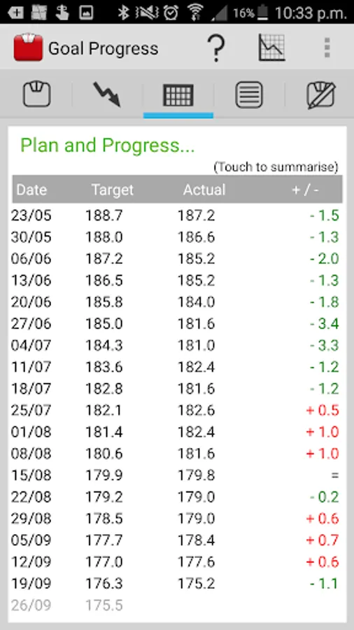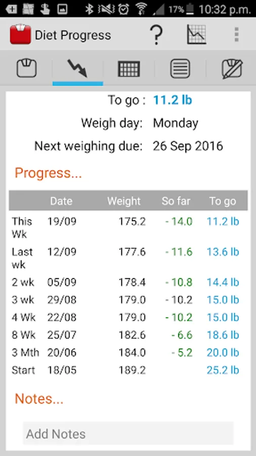 * Setup a Goal to achieve a particular weight by a certain date. Weekly target weights are automatically calculated for you to track how you are progressing