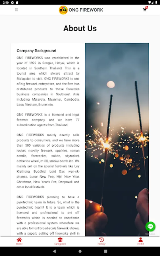 ONG FIREWORKS was established in the year of 1997 in Songka, Hatyai, which is located in Southern Thailand. This is a tourist area which always attract by Malaysian to visit. ONG FIREWORKS is one of big firework enterprises, and the firm has distributed products to those fireworks business companies in Southeast Asia including Malaysia, Myanmar, Cambodia, Laos, Vietnam, Brunei etc.