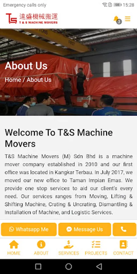 T&S Machine Movers (M) Sdn Bhd is a machine mover company established in 2010 and our first office was located in Kangkar Terbau. In July 2017, we moved our new office to Taman Impian Emas. We provide one stop services to aid our client’s every need. Our services ranges from Moving, Lifting & Shifting Machine, Crating & Uncrating, Dismantling & Installation of Machine, and Logistic Services.