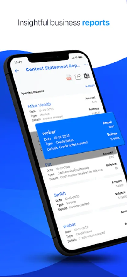 Calculate profit and loss with the help of real-time analytics. The app is integrated with appealing bar graphs and pie charts to help you track your cash influx and manage your business much more efficiently. Prepare financial reports and share them with your subordinates and supervisors with just a few taps.